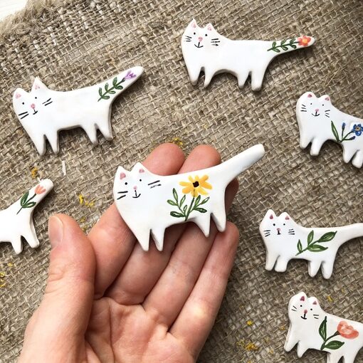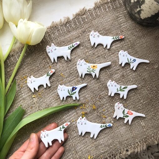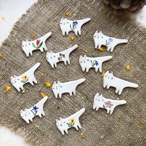 Брошки-коты с цветочной росписью 🌿 Можно сделать на заказ с любым цветком или растением, срок изготовления 5-7 дней. Расписаны вручную специальными красками, покрыты глянцевой глазурью.