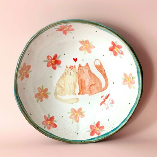 Миска с влюбленными котами сделана из качественных высокотемпературных немецких материалов. Расписана вручную специальными красками, покрыта глянцевой глазурью. Все глазури и краски пищевые, изделие можно использовать в посудомоечной машине, микроволновой печи.