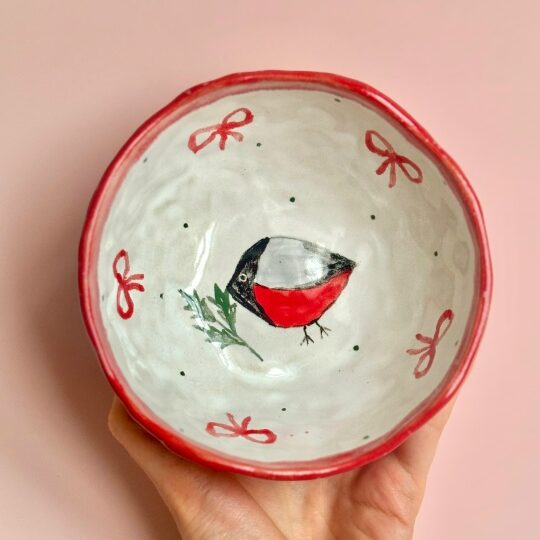 Мисочка со снегирем сделана из качественных высокотемпературных немецких материалов. Расписана вручную специальными красками, покрыты глянцевой глазурью. Все глазури и краски пищевые, изделие можно использовать в посудомоечной машине, микроволновой печи. По размеру подойдет для соусов, варенья, мёда, специй, для хранения украшений.