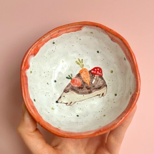Пиала с ежиком сделана из качественных высокотемпературных немецких материалов. Расписана вручную специальными красками, покрыты глянцевой глазурью. Все глазури и краски пищевые, изделие можно использовать в посудомоечной машине, микроволновой печи. По размеру подойдет для соусов, варенья, мёда, специй, для хранения украшений.