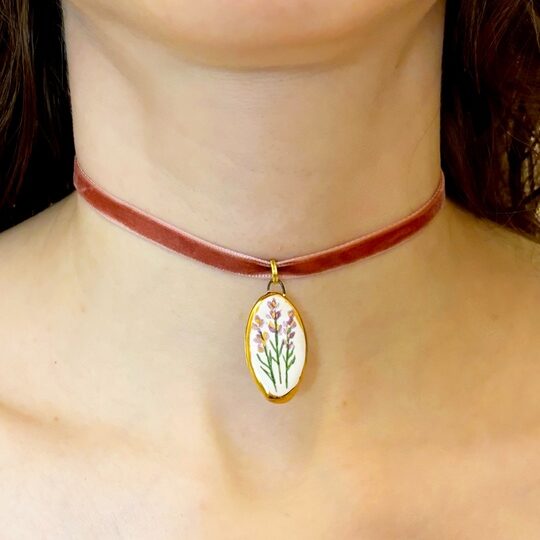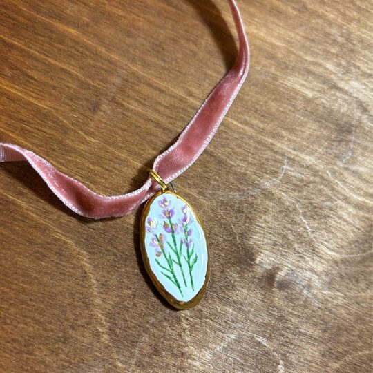 Подвеска «Лаванда» 🍃 Сделана из высококачественных испанских и немецких материалов, расписана вручную специальными профессиональными красками, покрыта глянцевой глазурью. Обрамление и вкрапления внутри соцветий расписаны настоящим жидким золотом ✨ Бархатный шнурок: ширина — 6 мм, длина ~ 90 см