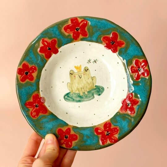 Тарелка с царевной-лягушкой и красными цветами. Сделана из качественных высокотемпературных немецких материалов. Расписана вручную специальными красками, покрыта глянцевой глазурью. Все глазури и краски пищевые, изделие можно использовать в посудомоечной машине, микроволновой печи.