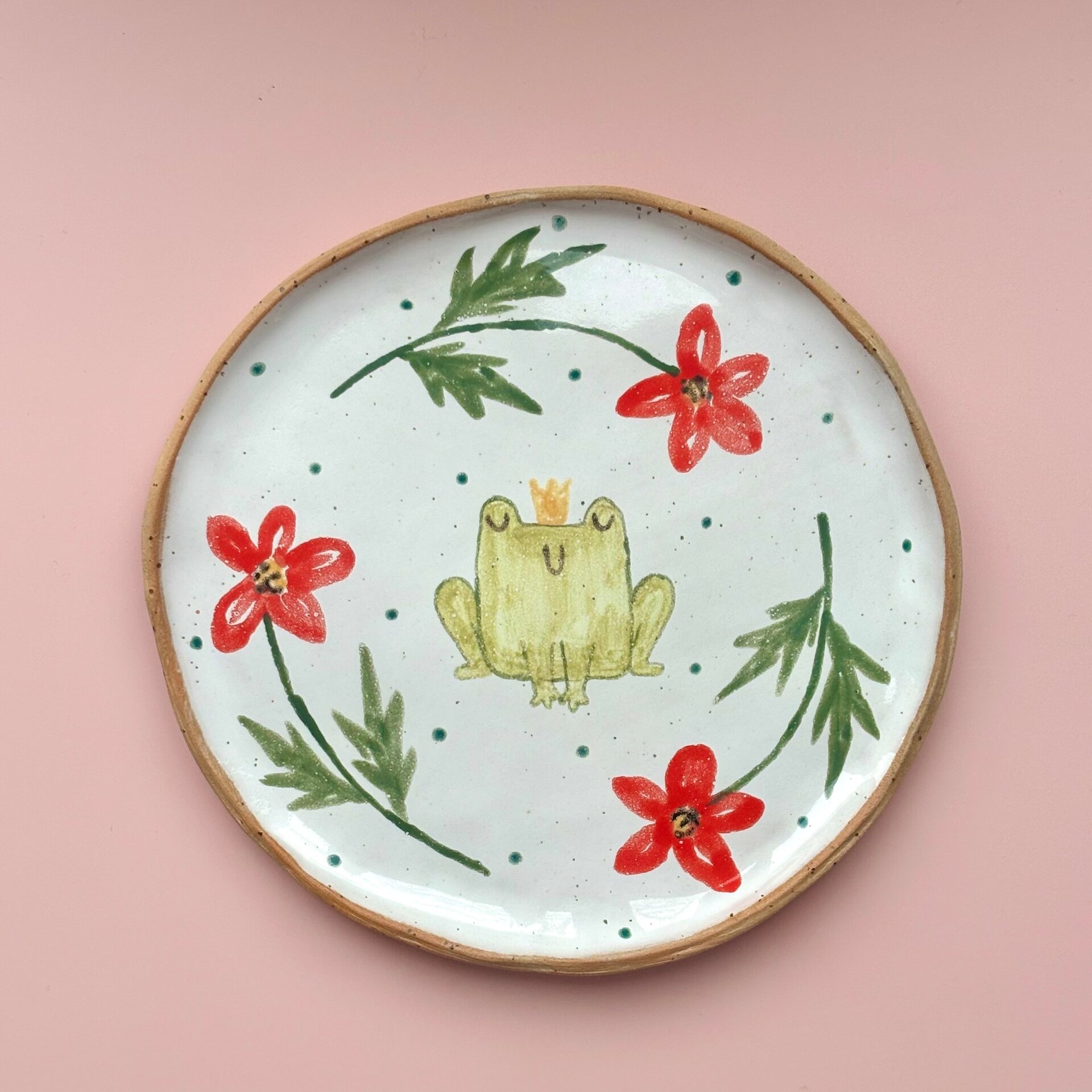 Тарелка с лягушкой и цветами. Сделана из качественных высокотемпературных немецких материалов. Расписана вручную специальными красками, покрыта глянцевой глазурью. Все глазури и краски пищевые, изделие можно использовать в посудомоечной машине, микроволновой печи.