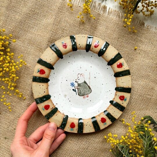 Тарелка с мышкой и земляникой 🍓🍃 Сделана из качественных высокотемпературных немецких материалов. Расписана вручную специальными красками, покрыта глянцевой глазурью. Все глазури и краски пищевые, изделие можно использовать в посудомоечной машине, микроволновой печи.