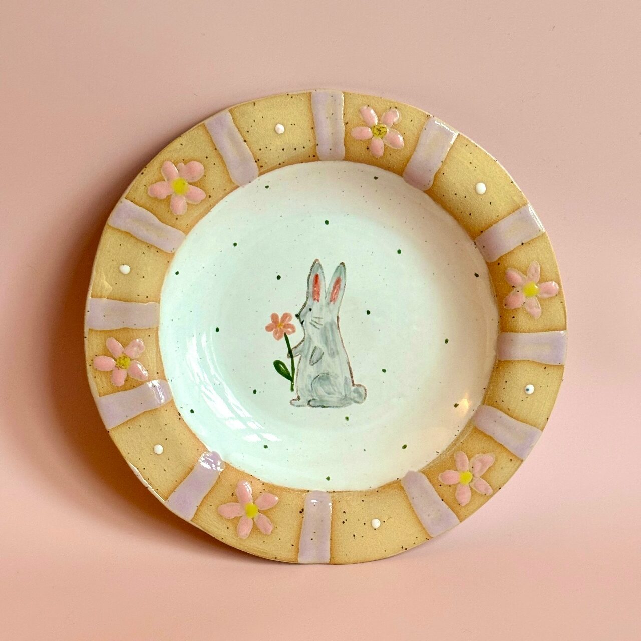 Тарелка с зайчиком и цветком 🐰🌷 Сделана из качественных высокотемпературных немецких материалов. Расписана вручную специальными красками, покрыта глянцевой глазурью. Все глазури и краски пищевые, изделие можно использовать в посудомоечной машине, микроволновой печи.